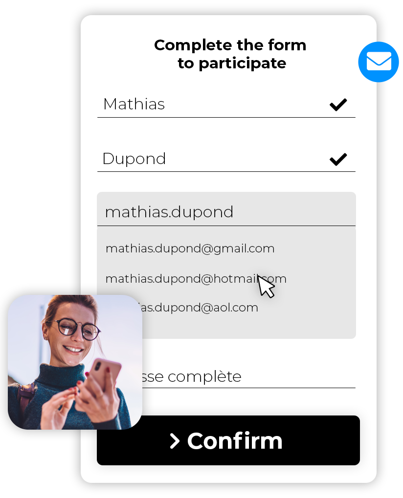 L’existence de l’adresse email entrée par le participant sera vérifiée dans son intégralité. Le participant ne pourra pas participer à votre campagne avec une adresse email inexistante. Ces actions s’effectuent automatiquement dès la saisie sur le formulaire.