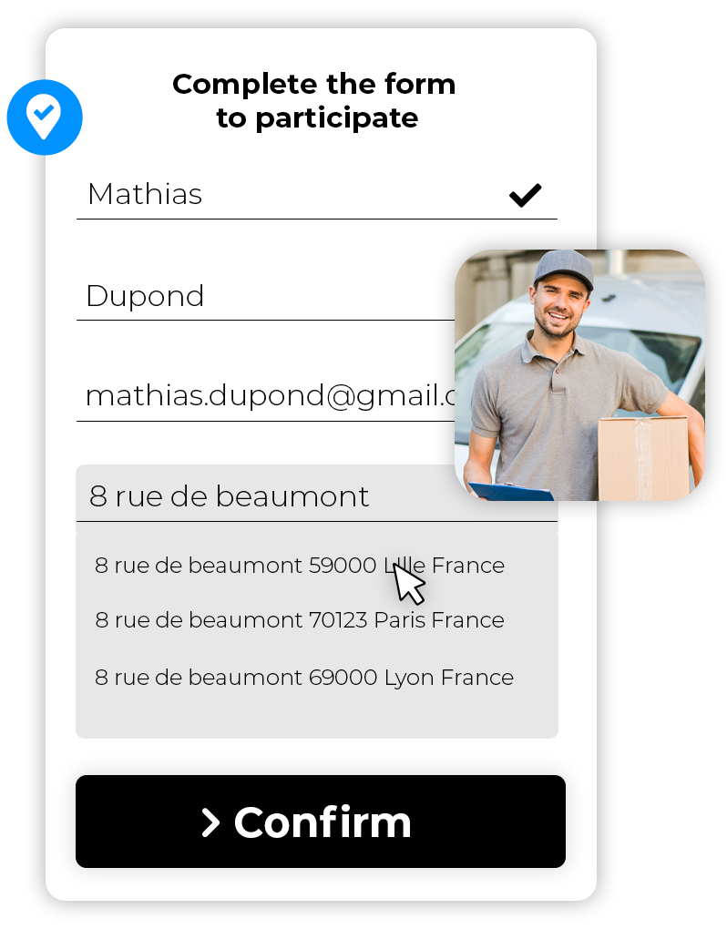 Se comprobará la dirección postal introducida por el participante en el formulario del juego y, en caso de error, se sugerirá una lista de direcciones cercanas. Además de cualificar su CRM, esta opción le permitirá limitar los errores a la hora de enviar los premios a los ganadores.