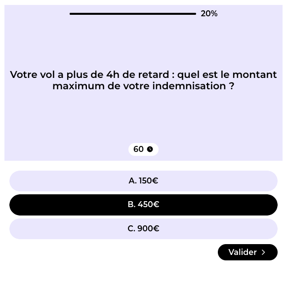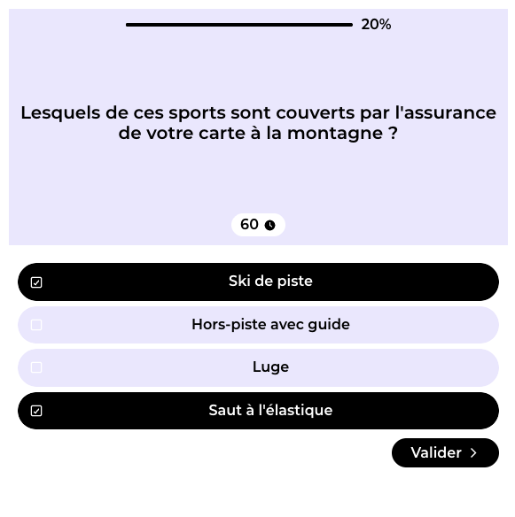 Augmentez le niveau de difficulté en demandant aux joueurs d’identifier toutes les bonnes affirmations. Ce mode est parfait pour présenter les multiples avantages d’un produit ou pour tester la précision des connaissances de vos experts et de votre communauté.