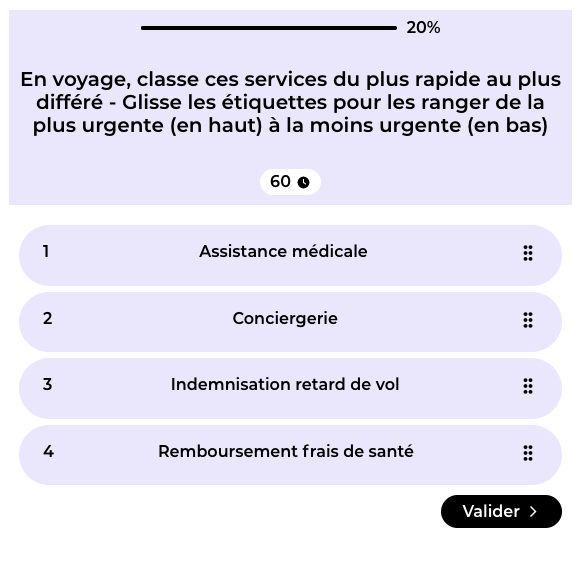 Sollicitez la logique de vos participants en leur demandant de réorganiser des éléments. Que ce soit pour rétablir la chronologie d’une histoire de marque ou pour classer des produits du plus ancien au plus récent, ce format demande une réflexion plus poussée et augmente le temps d’engagement.