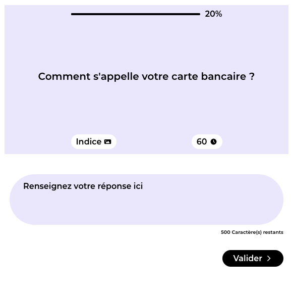 Donnez la parole à votre audience en lui permettant de saisir sa propre réponse. Ce mode est particulièrement utile pour les énigmes complexes, la collecte d’idées (UGC) ou pour vérifier qu’un utilisateur connaît réellement la réponse sans l’aide de propositions.